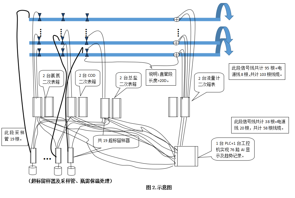 六、技術(shù)要求: 1測量設(shè)備的安裝:氨氮、COD(已招標(biāo),以后不再重復(fù))、總鹽、流量計(jì)(已安裝,以后不再重復(fù))以及取水口分別科學(xué)、合理的安裝于污水管道上(如圖2.)。 2、二次表:氨氮二次表(兩個儀表箱)、COD二次表(兩個儀表箱)、總鹽二次表(兩個儀表箱)、以及流量計(jì)二次表(兩個儀表箱)分別放在相應(yīng)儀表箱內(nèi)。 3、節(jié)點(diǎn)信號:氨氮二次表、COD二次表、總鹽二次表分別提供超標(biāo)的節(jié)點(diǎn)信號,以及流量計(jì)二次表提供斷流的節(jié)點(diǎn)信號給留樣器。 4、留樣器(已招標(biāo),以后不再重復(fù)):設(shè)計(jì)安裝19路超標(biāo)留樣器,針對每條污水管線任何超標(biāo)現(xiàn)象,進(jìn)行采樣留存。 5、采樣要求:流量計(jì)無流量,停止采樣;氨氮、COD、總鹽的其中任何一個指標(biāo)超標(biāo),啟動超標(biāo)留樣器進(jìn)行采樣留存。 6、工控機(jī)(PLC):實(shí)現(xiàn)集中顯示以及實(shí)現(xiàn)歷史記錄查詢,并完成月報(bào)、年報(bào)。 7、短信提醒:超標(biāo)采樣的同時,發(fā)送手機(jī)提醒信息,說明是哪一路管線及何種指標(biāo)超標(biāo)采樣。 8、趨勢要求:集中實(shí)時數(shù)據(jù)顯示及歷史趨勢記錄顯示,歷史趨勢顯示方式為曲線型。 9、手機(jī)顯示:實(shí)現(xiàn)手機(jī)無線信號接收,集中實(shí)時顯示及趨勢記錄顯示。 10、房屋要求:乙方方提出房屋面積、保溫、防水等要求。 11、伴熱保溫要求:乙方完成合理的管線保溫伴熱的施工方案及材料清單。 12、乙方需安排專人進(jìn)行現(xiàn)場指導(dǎo)安裝。 13、詳見圖1.現(xiàn)場照片及圖二.初步安裝示意圖。 七、對投標(biāo)單位及投標(biāo)文件的要求: 1. 企業(yè)簡介 2. 營業(yè)執(zhí)照復(fù)印件(蓋公章) 3.法人身份證復(fù)印件及或代理人身份證復(fù)印件(蓋公章) 4.代理人委托書。 5. 主要業(yè)績(三年內(nèi)同等規(guī)模)(蓋公章) 6. 一年內(nèi)銷售合同(復(fù)印件蓋公章)。 7.投標(biāo)書中需包含有投標(biāo)方對所投標(biāo)設(shè)備的檢驗(yàn)、試驗(yàn)及驗(yàn)收標(biāo)準(zhǔn)的詳細(xì)敘述。 8.投標(biāo)書中需包含有投標(biāo)方對所投標(biāo)設(shè)備的設(shè)備性能保證方案的詳細(xì)敘述。 9.投標(biāo)單位可以在甲方提供的設(shè)計(jì)數(shù)據(jù)基礎(chǔ)上,提前與甲方溝通,征得甲方技術(shù)人員同意,優(yōu)化方案,但必須滿足相關(guān)國家或行業(yè)標(biāo)準(zhǔn)、規(guī)范。 10.甲方從相關(guān)投標(biāo)方中選擇質(zhì)量有保證、價格合適、既節(jié)能又經(jīng)濟(jì)的方案與供貨方合作。 八.設(shè)備的質(zhì)保及服務(wù)內(nèi)容 九.需報(bào)出設(shè)備的制作周期及交貨方式 十、投標(biāo)截止日期:2018年 3月16日18 時 開標(biāo)時間: 2018年3 月20 日 9:30 時 開標(biāo)地點(diǎn): 綠源公司一樓會議室 十一、聯(lián)系人:尹工 17733798538 滄州綠源水處理有限公司